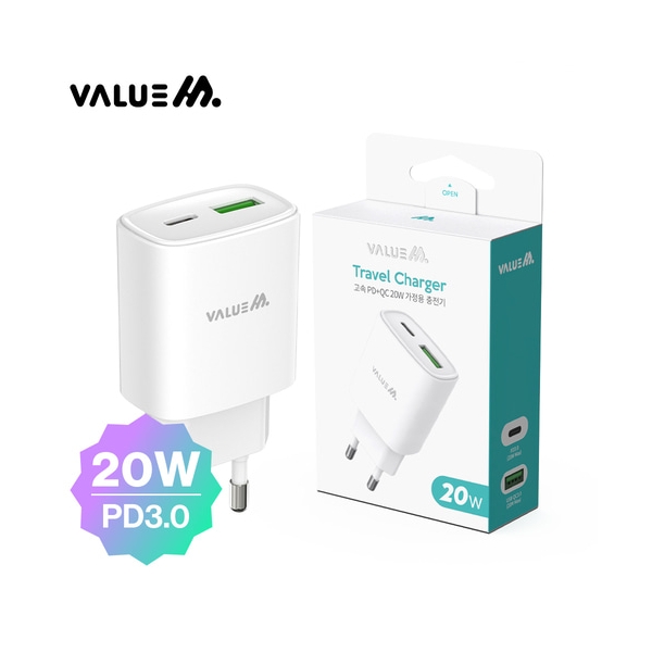 [밸류엠] 가정용 20W(PD3.0+QC3.0) 2포트 고속 분리형 충전기(케이블 미포)_화이트 요약정보 및 구매