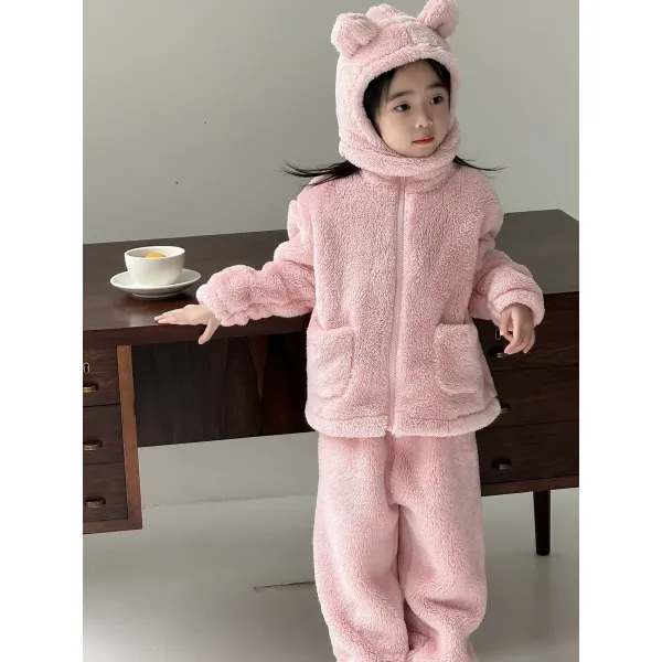 플리스 보온 어린이 잠옷 곰 모자 플러시 파자마